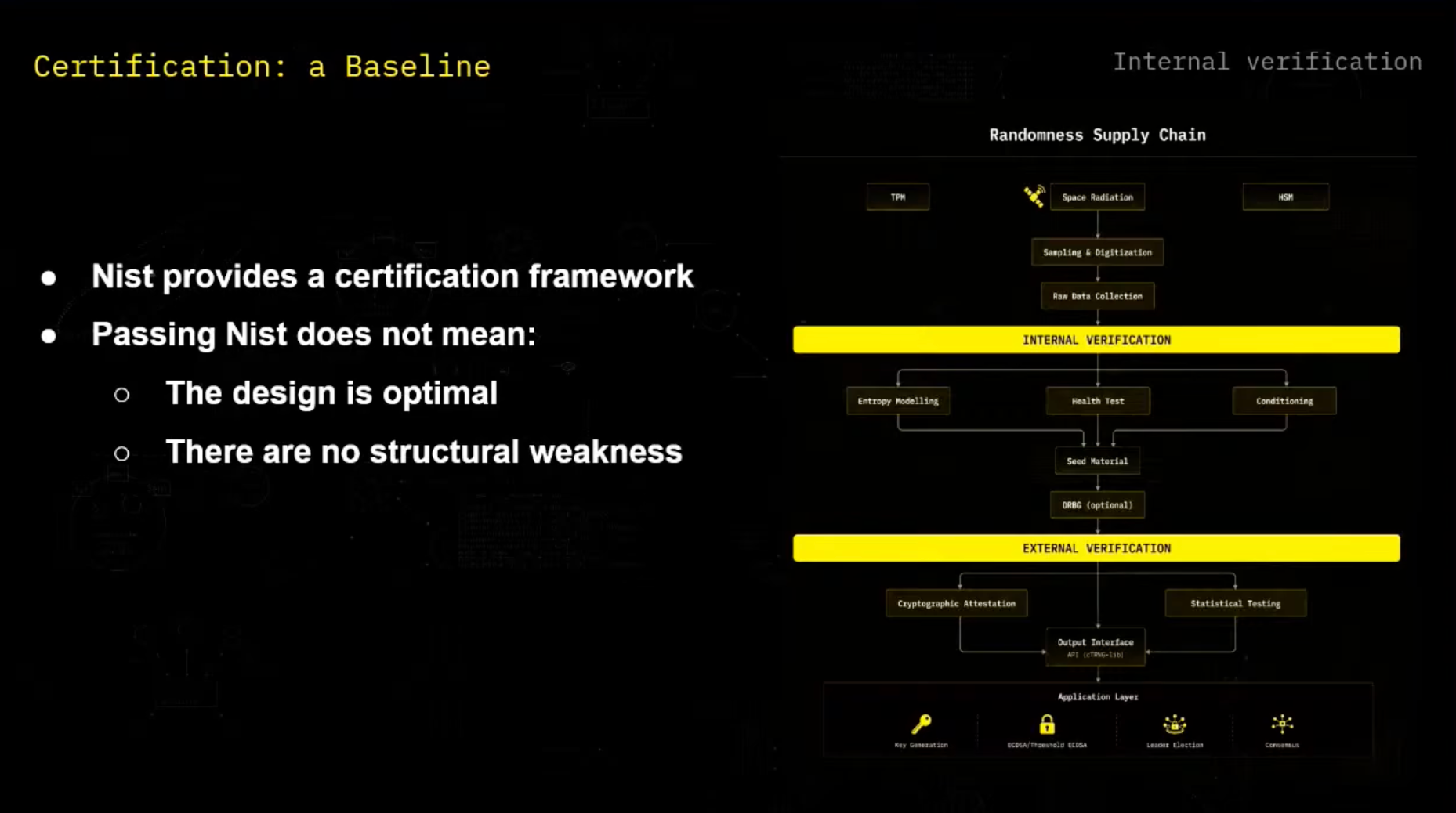 So if an attacker gets access to the input seed, then he's able to recover the whole sequence of number. And so let's start here with internal verification, how first we make sure as designers to correctly generate that randomness. And for this, we use the NIST SP-190 series, which is a certification framework.