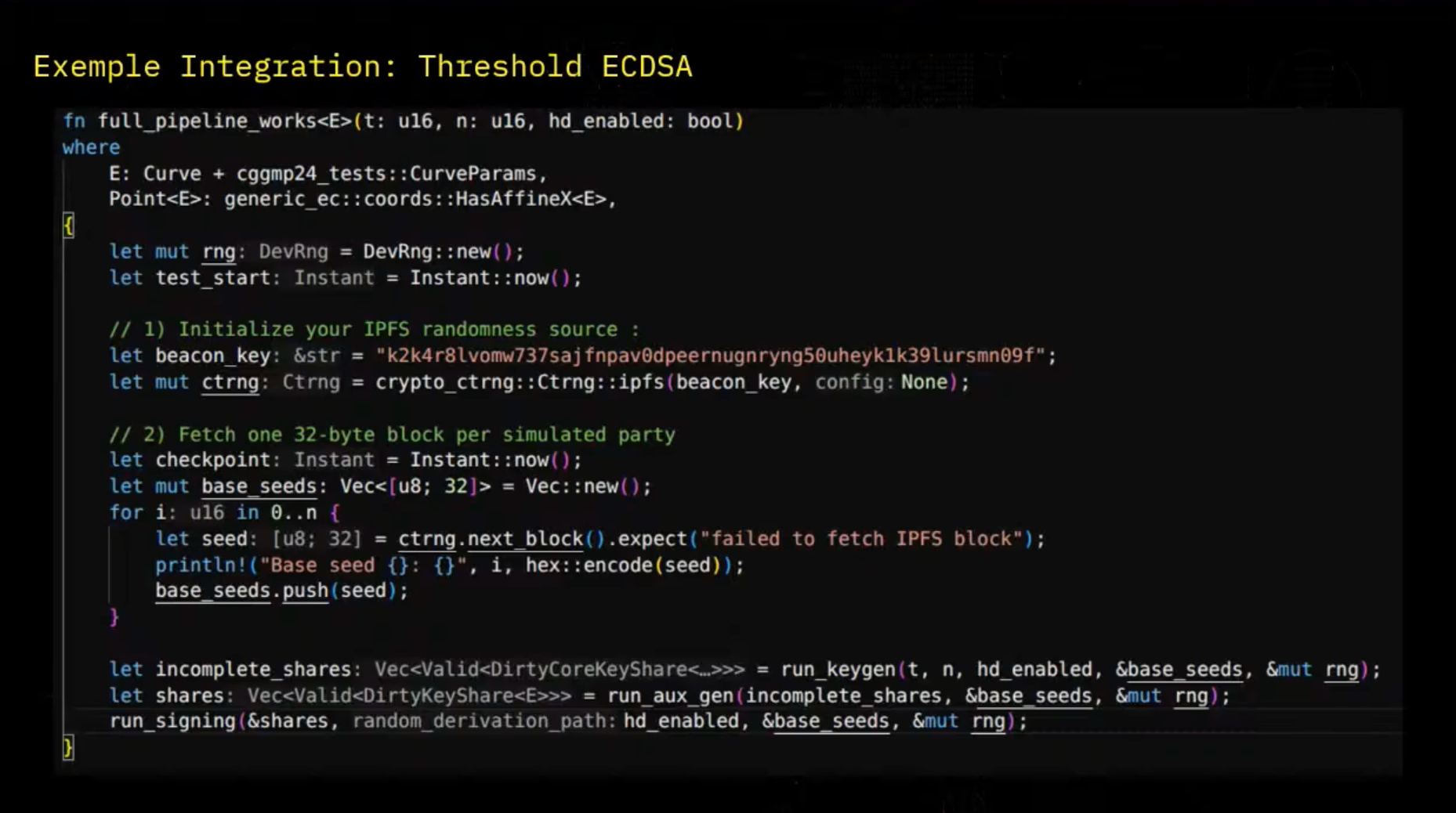 For example, when we have some virtual machine and some configuration, if they have some same setup configuration, we can end up by being able to gather randomness from all the VM concurrently. So here we're having the code of the Loch Ness repository from DFNS in which they perform threshold ECGSA. So first we define our EPFS random source with a beacon key.