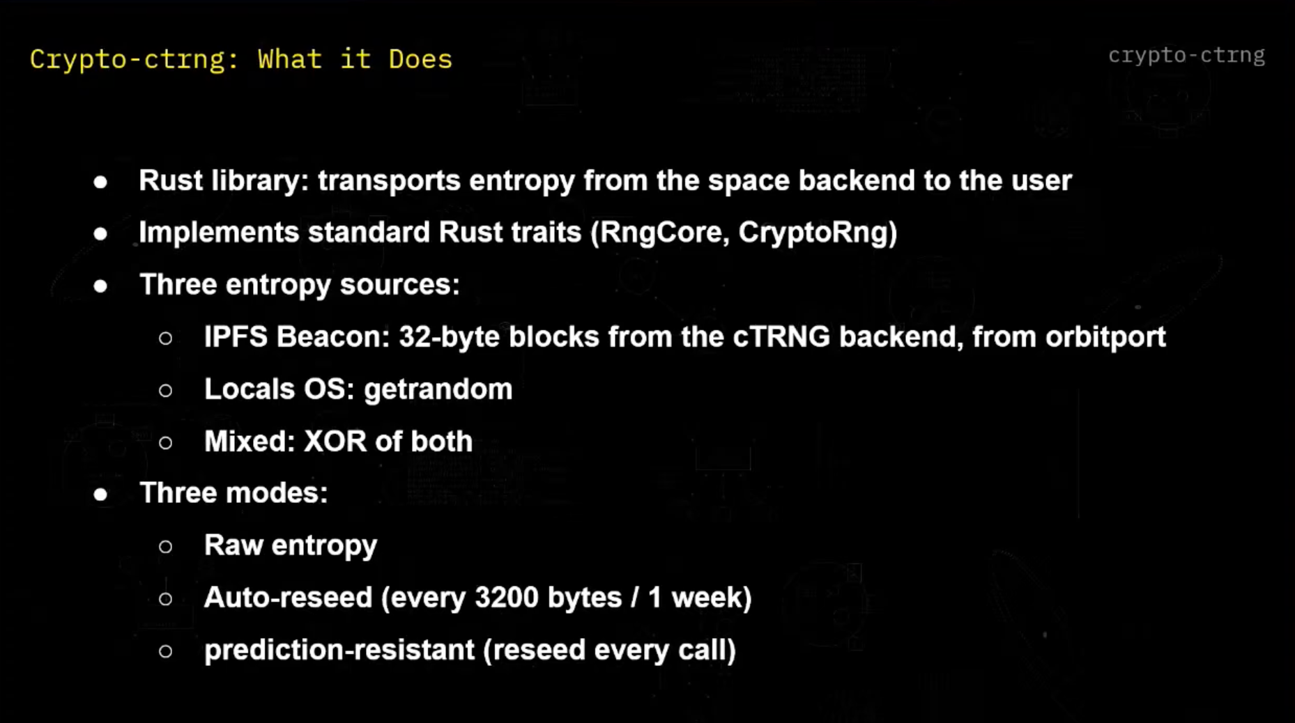 So yeah, one of the applications that we have with our space infrastructure is cTRNG. And we were first thinking, why are we talking about randomness? Usually, when we're talking about cryptographic protocol security, we are talking about code, about audit, about monitoring, and we treat randomness as an assumption. But we should not.