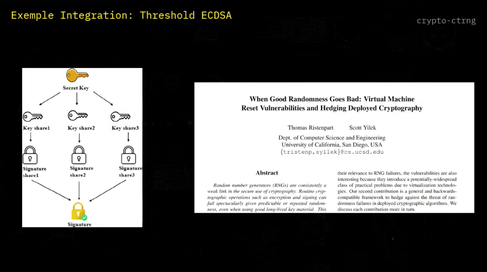 And if you want maximum security, you can use a prediction resistant mode in which you're calling our API at every call in order to receive your RNG. So let's take a look at an example of integration into an existing cryptographic protocol. So for recall, what is threshold ECGSA? Instead of having one user that have a secret key and that generates a signature, we're splitting that private key into different shares.